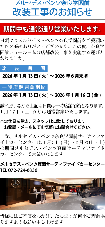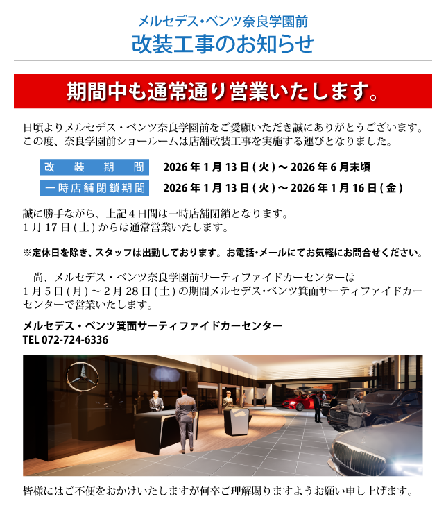 スマホ用ページ最上部スペース Urban StarsG-ClassV-ClassE-ClassCLE_CabrioletMercedes-Maybach-EQS-SUV Slide 1 Slide 1 Slide 1メルセデス・ベンツ購入をご検討中の皆様に役立つメニューを集めました。 各種ご購入サポートをご活用下さい。 詳しくは、各店のセールススタッフへお気軽にお尋ね下さい。 全車WEBカタログ各モデルのカタログ(パンフレット)をWEB上で閲覧することができます。詳しくみる 全車価格一覧各車の価格を一覧表でご確認頂けます。ご購入のご参考に。詳しくみる 見積シミュレーション装備や色など、あなたにぴったりのモデルをシミュレーションすることができます。詳しくみる ファイナンス/保険各種ファイナンス商品をご紹介。モデル別の支払方法や、メルセデス・ベンツ自動車保険もご提供いたします。詳しくみる link_6 サーティファイドカー(認定中古車)の 入庫速報を配信しています LINE@ メルセデスに関するお役立ち情報 なるほどメルセデス! ■2024年新型【Eクラス】紹介 メルセデスに関する お得な情報 操作解説 豆知識 などを動画で配信中! Mercedes Youtube ■EQAとEQCをご紹介 ■ステアリングボタン解説 ■Bluetoothの接続方法解説 ■おすすめ便利機能3選 Mercedes-Benz Collection ファッション、ライフスタイルなどのおすすめアイテムをご紹介しています。 Mercedes-Benz LIVE! メルセデスの多彩な車種に重なる、上質なライフスタイルコンテンツを発信します。 Mercedes me Store あなたのメルセデスが利用できるデジタルプロダクトを購入することができます。 見積シミュレーション 最高のメルセデスをあなたに。 森ノ宮店 店舗ページへ 箕面店 店舗ページへ 箕面サーティファイドカーセンター 店舗ページへ 奈良学園前店 店舗ページへ